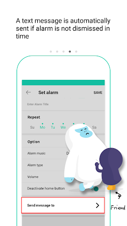 3. Alram Message : If you can not turn off the alarm within the set time, try specifying a friend who can wake up instead. We will send a text to a friend asking a wake-up call when you can not wake up by alram.