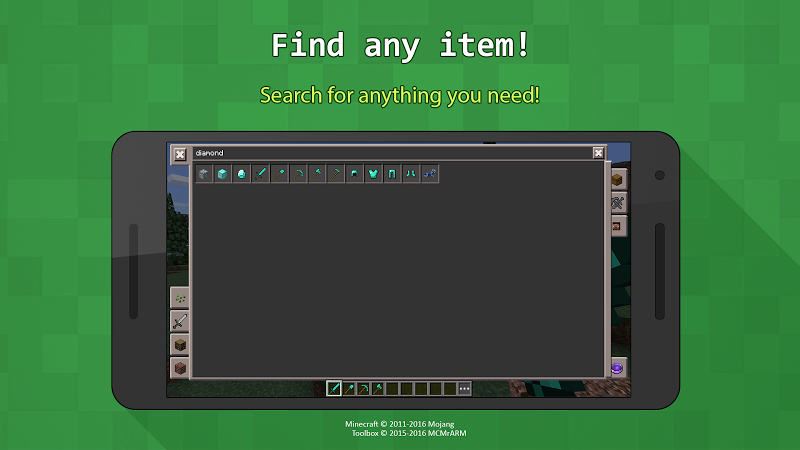 Toolbox is a launcher/modification for Minecraft: PE (MCPE) that allows you to give yourself items (just like in the popular Too Many Items modification), potion effects, change gamemode, set health, time, weather, enchant items, spawn, remove or set health of all entities of a certain type, see valuable blocks using a special mode called X-Ray, and much more!