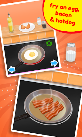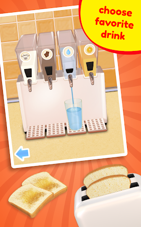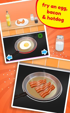 At first, put a little oil in the cooking pan and fry an egg, some bacon and hotdogs. Spice the food of your choice with a pinch of salt and pepper if you wish. To satisfy different tastes, you can cook the world-famous full English breakfast, ham and eggs or fried egg. You can also toast slices of bread and choose your drink: milk, chocolate drink, water or orange juice – but be careful when you pour!