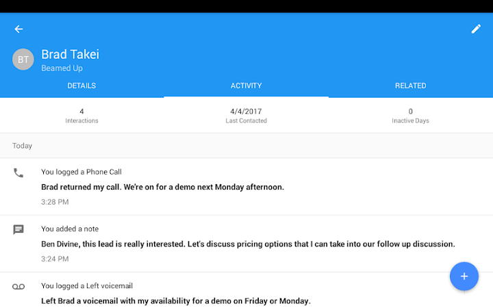 With our mobile app, it's super simple to log calls, create tasks and follow-up reminders, and make updates to the system in real-time. No need to sync, save notes in another place or wait until you get to the office to stay on top of your work.
