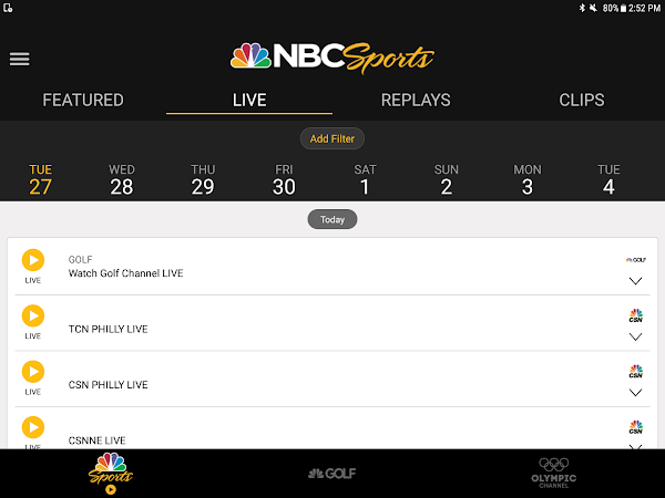 Watch thousands of LIVE events on NBC, NBCSN, and more, with the NBC Sports App!Watch thousands of LIVE sporting events airing on NBC, NBCSN, Olympic Channel, Golf Channel and more with the NBC Sports app!