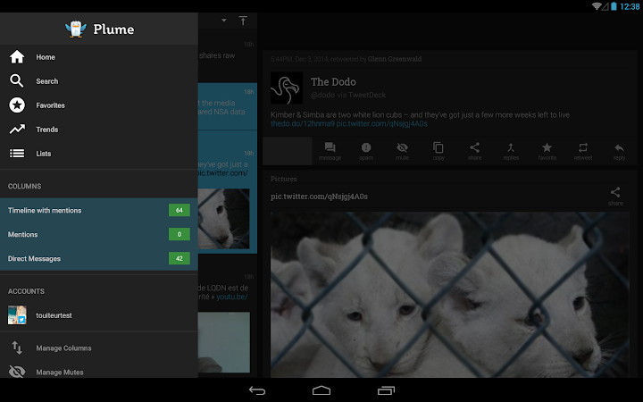 Plume, a beautiful, highly customizable Twitter client for you!Plume is a beautiful and completely customizable Twitter app that will revolutionize the way you use Twitter! Brought to you by the authors of the popular Beautiful Widgets, Plume is one of the best Twitter clients for Android! (Plume was formerly known as Touiteur)