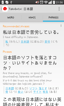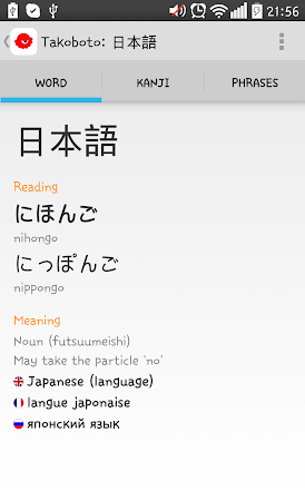 Learn thousands of Japanese kanji with flashcards, quizzes and writing practice!Takoboto is an offline Japanese-English, English-Japanese dictionary and Japanese language learning tool. It includes translations of some words in French, German and Russian and displays example sentences, kanji information and conjugated forms for each word.